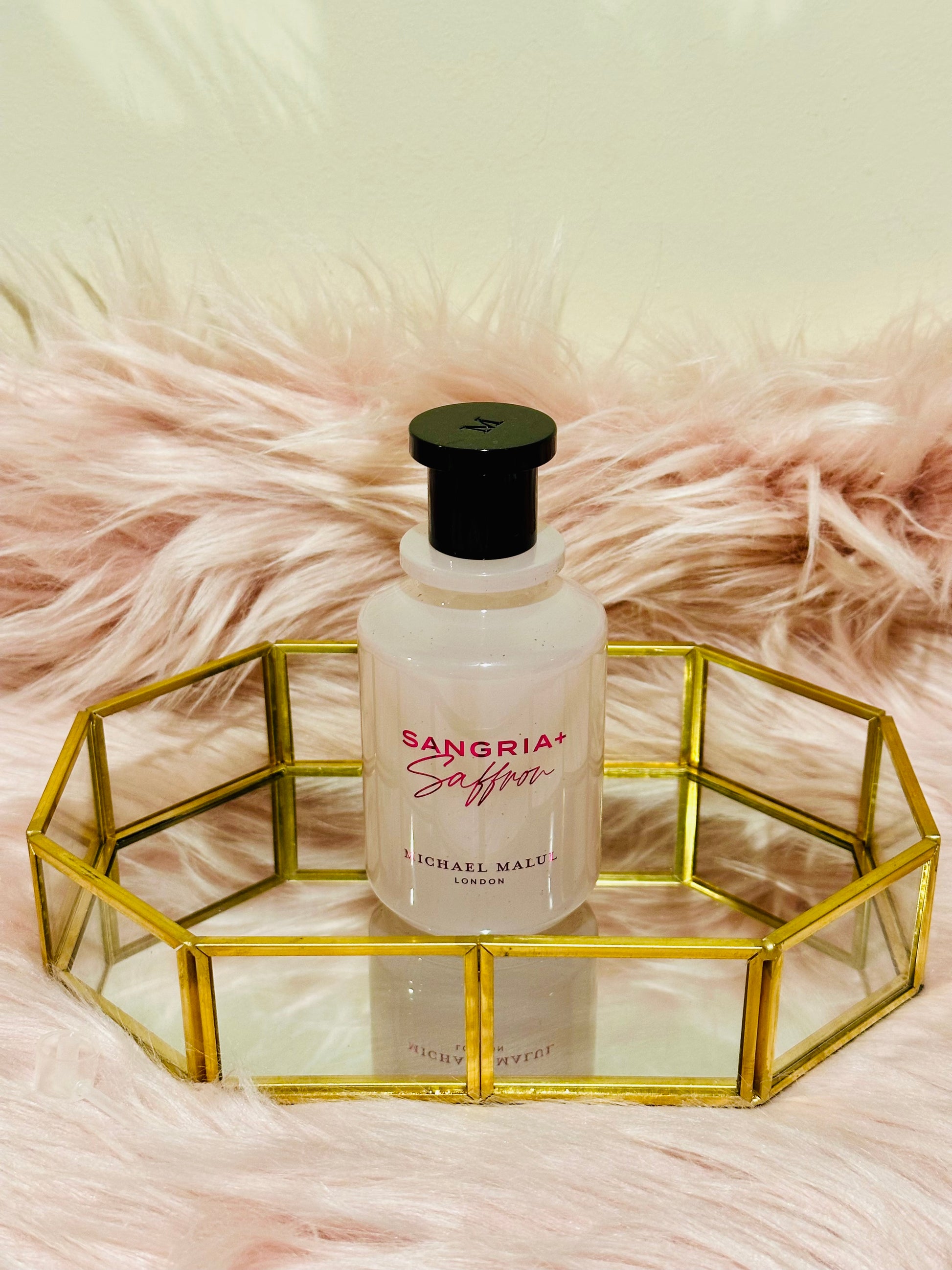Top notes are Saffron, Orange and Green Apple; middle notes are Raspberry, Damask Rose, Jasmine and Lily of the Valley; base notes are Ambergris and Suede.