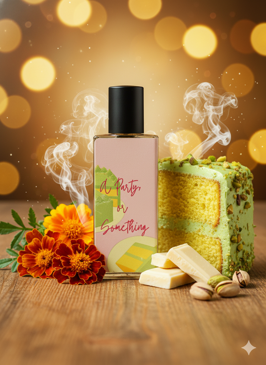 A Party, Or Something: Marigolds, yellow cake, white chocolate, pistachio buttercream, Iso E Super, Cashmeran