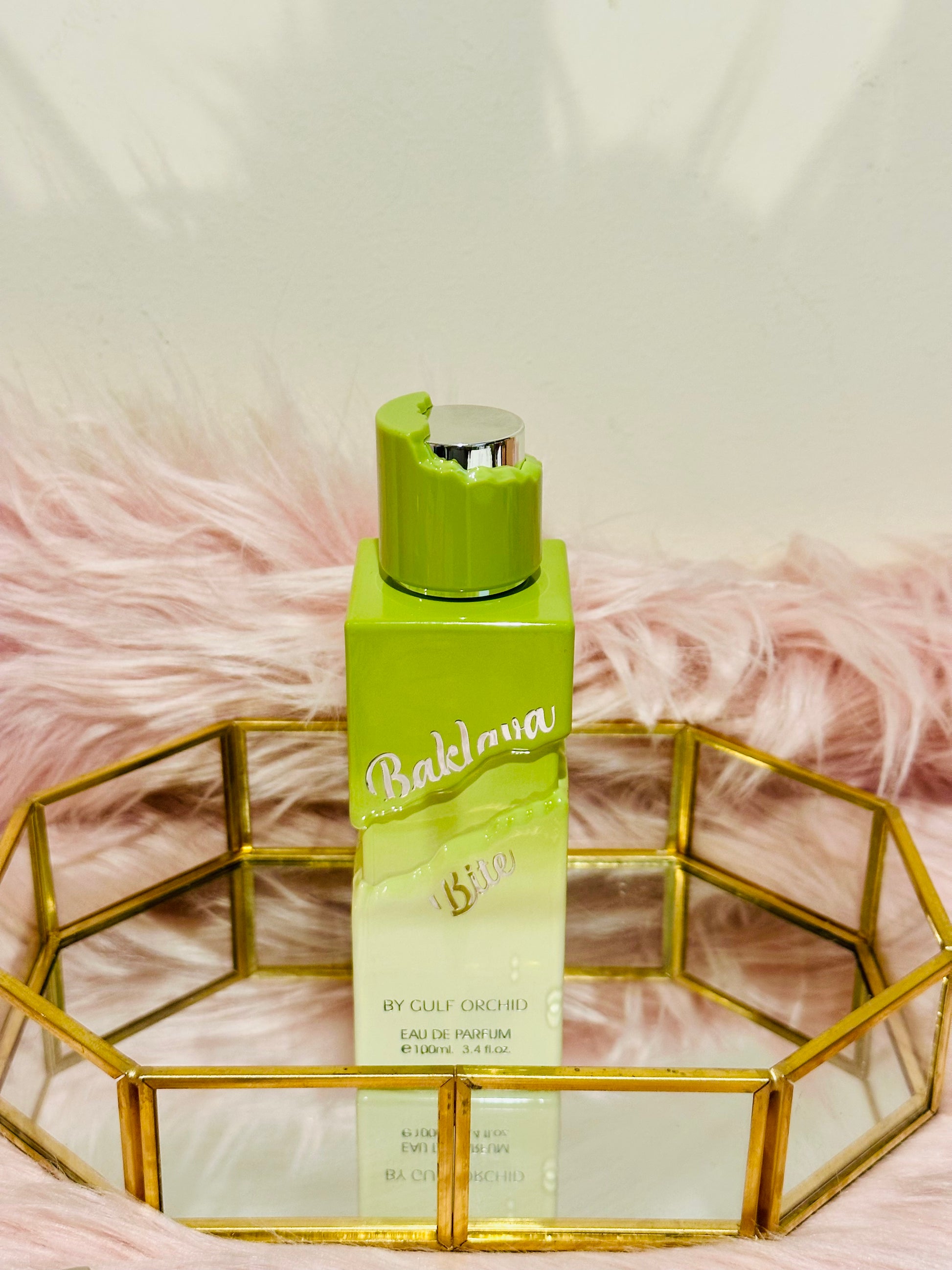 Top notes are Pistachio and Honey; middle notes are Cake, Peach and Milk; base notes are Caramel, Vanilla, Tonka, Sandalwood and Cedarwood.