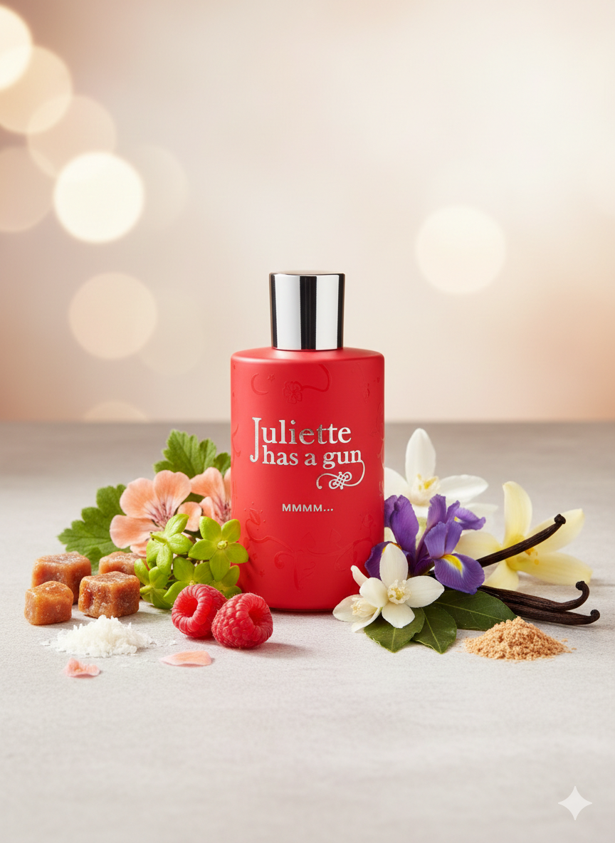 Top notes are Raspberry, Geranium and Neroli; middle notes are Tuberose, Iris, Jasmine Sambac and Orange Blossom; base notes are Vanilla, Caramel, Sandalwood, Heliotrope, White Musk and Patchouli.