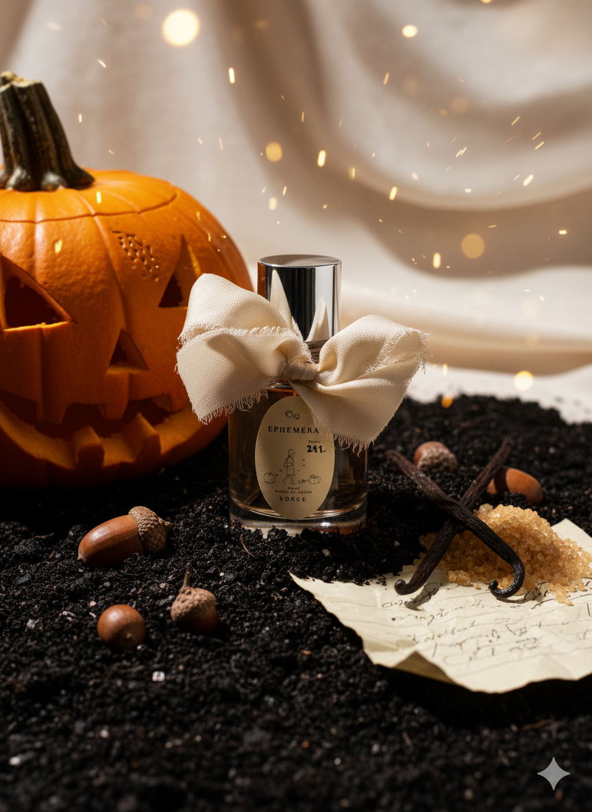 Ephemera: Fresh carved pumpkin, brown sugar, notebook paper, black soil, acorns, vanilla absolute, cashmere, milky musk *atmospheric gourmand