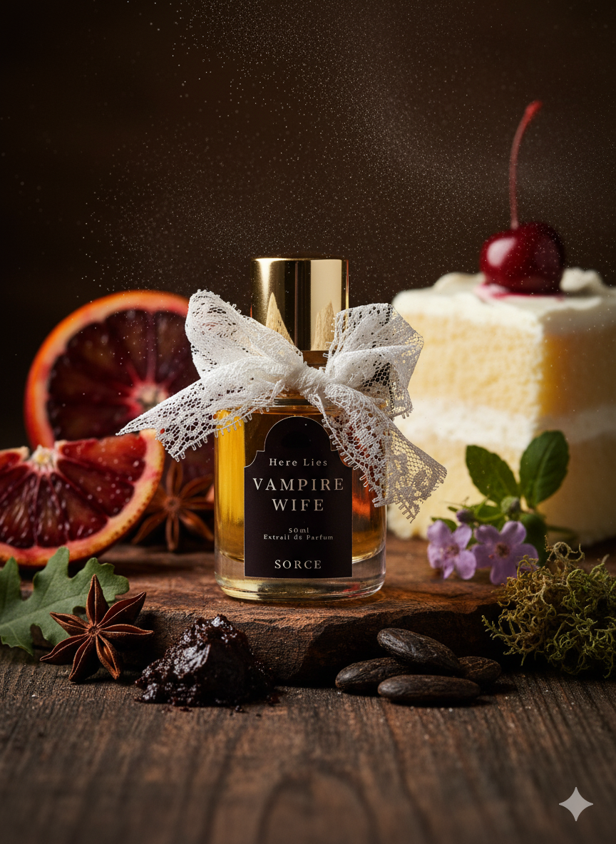 Vampire Wife: Blood orange, star anise, wedding cake, peru balsam, tonka bean absolute, heliotrope, oakmoss, powdered skin *musky aromatic gourmand